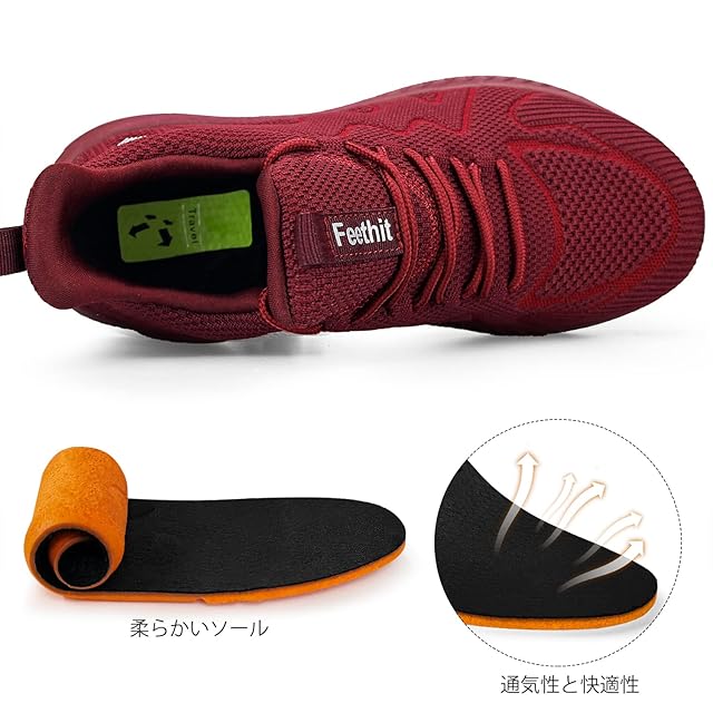 [Feethit] スニーカー メンズ ランニングシューズ 通気 軽量 滑り止 スポーツシューズ ジョギング ウォーキング 運動靴 お洒落 カジュアル ジム 旅行 通学 通勤 日常着用 ワイン レッド 27.5CM