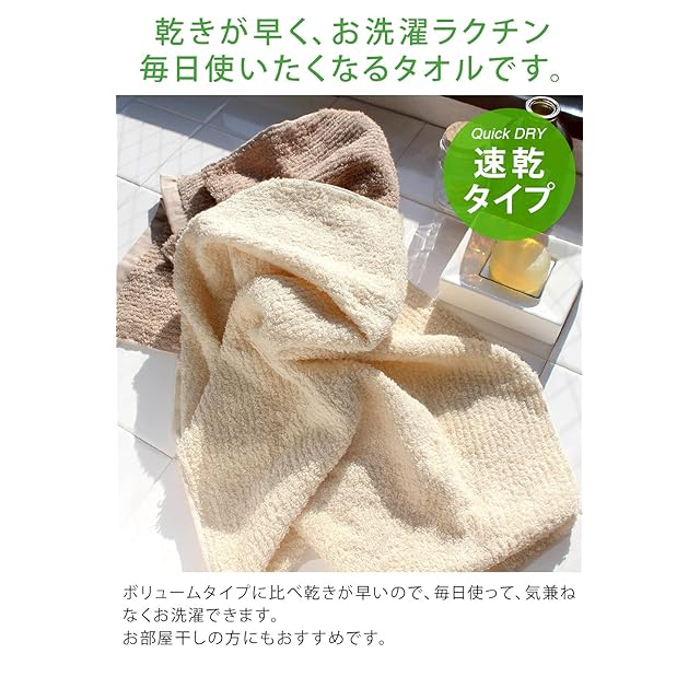 【速乾で衛生的】ちょっと薄手の速乾タイプ。乾きが早く、清潔で衛生的です。毎日使いにちょうどいいデイリータオルです。あぜ織(細いストライプの織り柄)を入れているので、細番手のパイルがふんわりと立ち上がり、顔を拭いてもべたっとしにくく心地よくお使いいただけます。