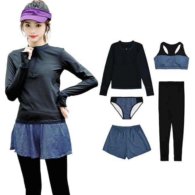[Teddy] フィットネス 水着 レディース 体型カバー 5点セット 長袖 ラッシュガード スポーツブラ ショーツ ショートパンツ トレンカ hys2122 黒 (ブラック×ブルーグレー, L(11号))