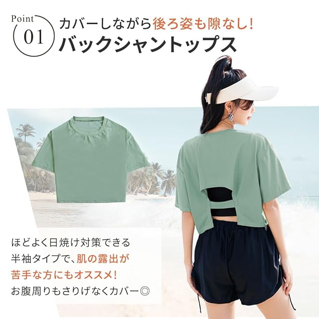 セット内容・4点セット ・ブラ一体型トップス ・ショーツ ・ショートパンツ ・シャツラッシュガード クロップド丈でトレンド感◎シンプルデザインでママさんにも◎ クロップド丈 おしゃれ かわいい 大人水着こなれ感 露出控えめ