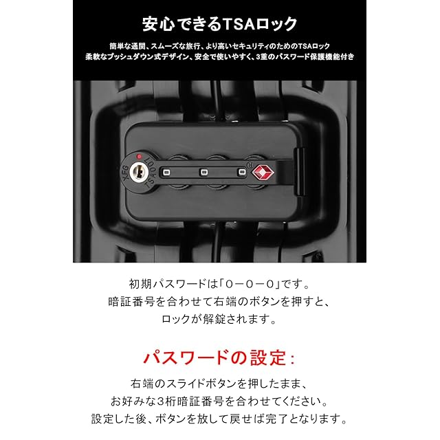 【ロック】国際TSAロック搭載。 (鍵穴は空港職員専用となります。キーは通関用であり、購入者には渡されません。)【多段階キャリーバー】旅行箱は身長や状況に応じて自由に長さを調節できます。自分に似合う高さをボタンで調節します。レディ―スにもメンズにも十分にピッタリです。