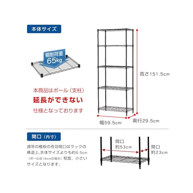 ドウシシャ ルミナス互換 5段 幅60 スリムスチールラック 棚 収納 黒 ブラック 全体耐荷重325kg 幅59.5cm×奥行29.5cm×高さ151.5cm M1560305BK 頑丈 ワイヤーシェルフ 奥行30 ポール径19mm パーツ対応 キッチン ランドリー