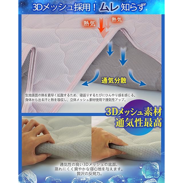 【3Dメッシュが「呼吸する敷きパッド」を実現!】 まるでベッドが息をするような3D立体メッシュ構造が、熱と湿気を効率的に排出!空気の通り道を最大化した設計で、従来の冷感ベッドシーツに比べ通気性が2倍も向上しました。汗をかいても表面がベタつかず、朝まで「サラッとした寝床」をキープします。 高密度織りながらも柔らかな肌触りを両立し、体圧を分散して肩・腰への負担を解消します。通気性良く凹凸構造で、一晩中「風が通る帝人 敷きパッド」を体感できます。寝具の蒸れが気になる方や、暑さで寝つけない方にこそ試してほしい、新世代の通気性基準です。
