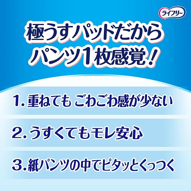 うすさ約1/2※1だから、パンツ1枚感覚。パンツと重ねてもごわごわしない紙パンツ専用尿とりパッド ※1 ライフリー尿とりパッド女性用2回吸収との比較です。