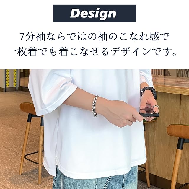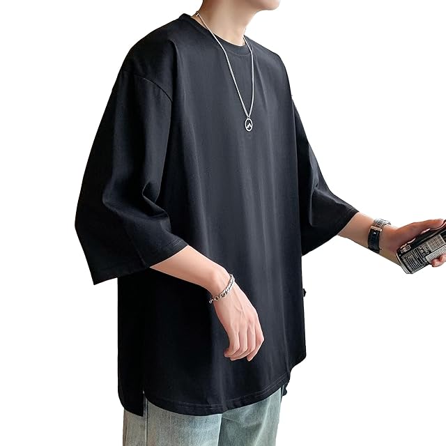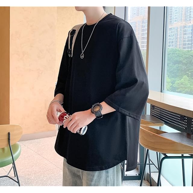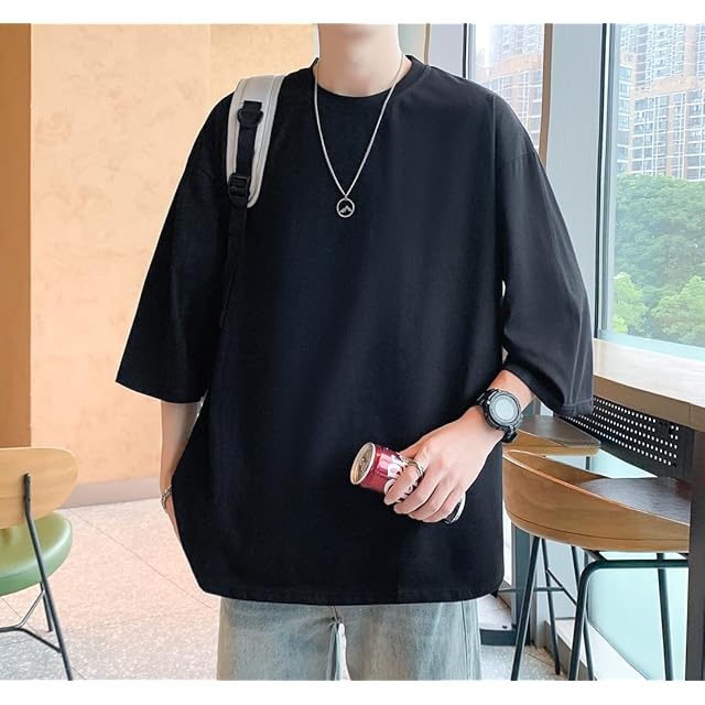 [Culeevp] 夏服 メンズ tシャツ 半袖 大きいサイズ 無地 7分袖 ラウンドカット 柔らかい黑L