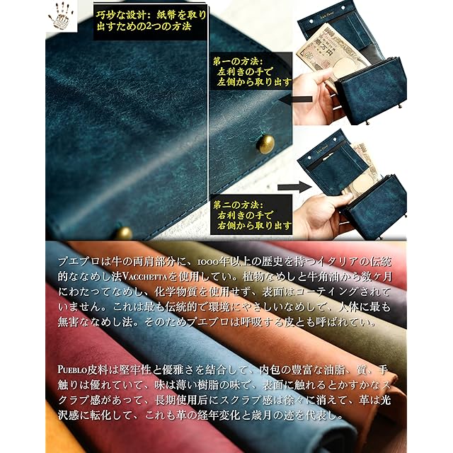 【皮について】プエブロは牛の両肩部分を使用し、1000年以上の歴史を持つイタリアの伝統タンニン法「Vacchetta」を使用しています。植物なめしと牛角油で数ヶ月にわたってなめし、化学物質を使用せず、表面はコーティングされていません。これは最も伝統的で環境に優しい革の製法で呼吸する牛革と呼ばれています。Pueblo皮料は堅牢性と優雅さを結合して、豊富な油脂を含んでいて、質、手触りはとても良くて、表面に触るとかすかな磨り感があって、長期使用すると磨り感が徐々に消えて、革は光沢感に転換して、味は薄く樹脂の味になります