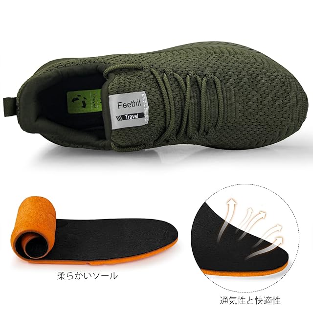 [Feethit] スニーカー メンズ レディース ランニングシューズ 通気 軽量 滑り止 スポーツシューズ スリッポン ジョギング ウォーキング 運動靴 お洒落 旅行 通学 通勤 日常着用 グリーン 25.0cm