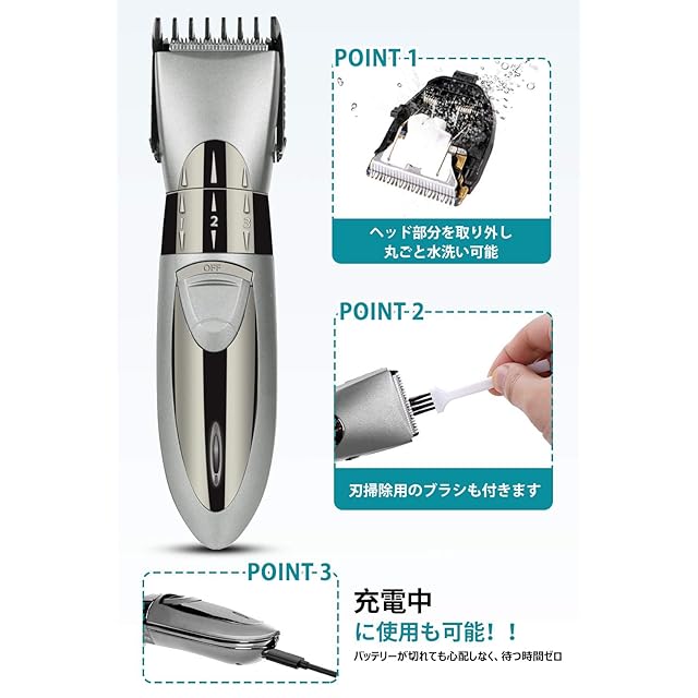 【防水仕様&低騒音バリカン】バリカンは水洗いできるので、バリカンの刃を取り外し、水洗いだけで洗浄可能です。 刃の部分を着脱でき、水でサッと洗い流せます。また、掃除用ブラシも付属しているので、刃や本体などに付着した細かい毛くずを払い落とすことも可能です。子供が驚きにくい低騒音の稼動音、動いているお子様の髪を切るのは危険です。この商品は65db以下の低稼動音にこだわりました。部屋で会話をするのと同じくらいの音量なので、お子様が驚くことはほとんどありません
