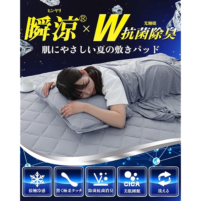 【先端テクノロジー搭載×業界最高Q-MAX値 冷感敷きパッド】究極の冷感を求め、弊社の冷感 敷パッドは先端技術瞬涼糸を使用、冷感繊維一本一本にこだわりました。業界最高レベルの接触冷感値0.531(Q-MAX最大熱吸収速度W/㎠)で、究極の冷たさを実現!※接触冷感(q-max:W/㎠)基準0.2の約265%の究極冷感値。さらに、冷感面は10%のポリウレタン入りなので、より熱伝導率の高い鉱石冷感繊維を導入し、W冷感効果で圧倒的な冷感を実現!一瞬触って冷たいだけではなく、寝返るたびに『ひんやり』が復活!驚きのスピード冷感敷きパッド。夏でも快眠!朝まで快適な眠り!