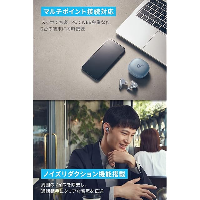 ウルトラノイズキャンセリング 2.0:Anker独自技術のウルトラノイズキャンセリング 2.0により、ノイズキャンセリングの強度を自動で調節します。また、風切り音の低減機能も搭載しています。
