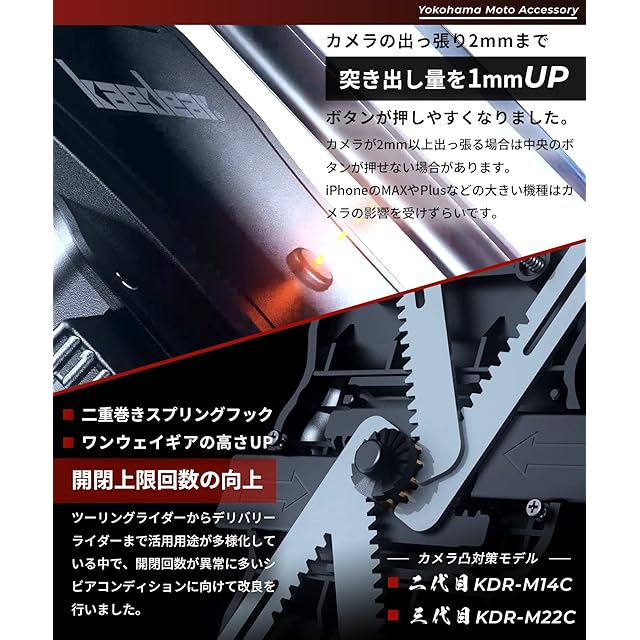 【元祖クイックホールドの後継モデル】 地球上で最も早く片手でスマートフォンの付け外しが可能なスマホホルダー。スマホを押し付けるだけで瞬時にホールドし、両脇のリリースレバーを握るだけで開放します。「Airアブソーバーの取り付けは難しそう」、「初代クイックホールドが好きだけどカメラの出っ張りのせいで使えない」 、「アームをロックして不測の事態に備えたい」そんな方にオススメなモデルの最新作クイックホールドⅡ(Airアブソーバー)/KDR-M11CJPです。