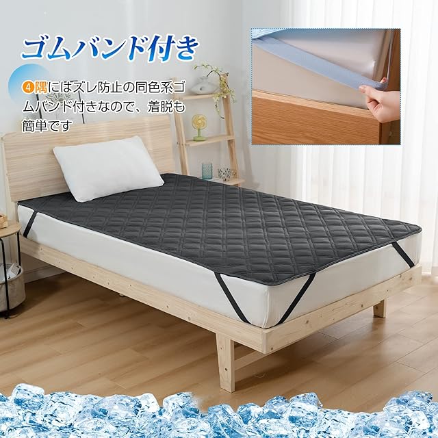 【両面使える&ゴムバンド付き】表地は接触冷感生地で、触れるとひんやりとし、寝苦しさを軽減させます。裏地は柔らかく着心地の良いワッフル生地で、夏が終わっても全く心配なく、反転しても使いやすい商品。季節を選ばないオールシーズン使用可能で、春・秋・冬も完全OK!。敷きパッドの四隅に滑り止めのゴムバンドが付いていて、敷きパッド をマットレスにしっかり固定できる。同じ色のゴムバンドを使用しているので、より美しくなる。お洗濯の際の取り外し&取り付けも簡単なので、使いやすくて、家事の負担も軽減してくれる。