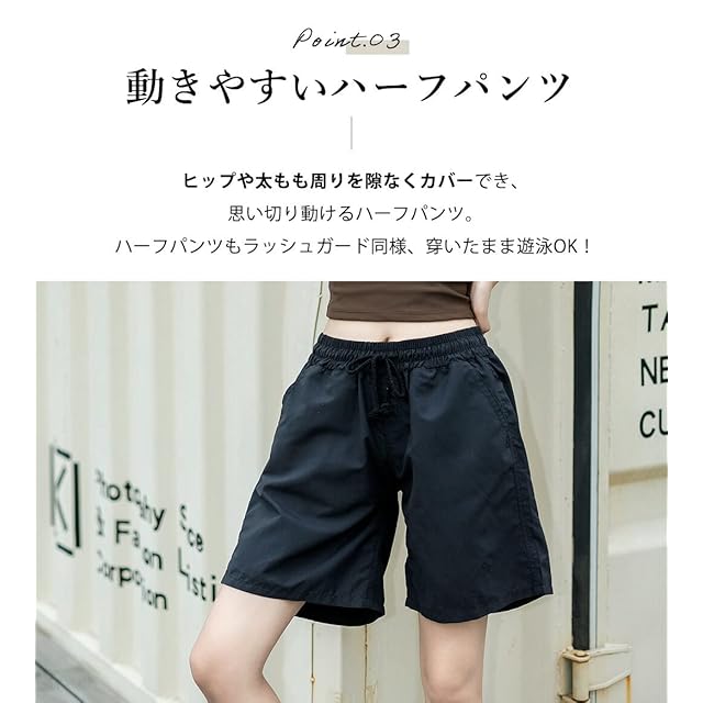 #05嬉しい長袖トップスフィンガーホール付きで手の甲まで日焼け対策!ドローコードで裾周りの調節も◎#06安心ハーフパンツ 気になるヒップ~太ももをしっかりオシャレにカバー◎