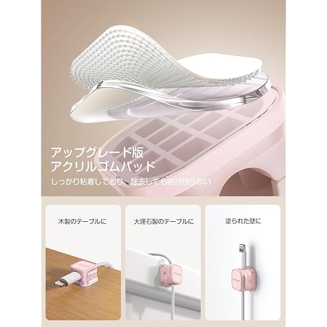 【強力両面テープ·残留性ない!】強化されたアクリル粘着テープを採用して、木製やガラス製、プラスチック製や大理石などの色々な材質の平らできれいな表面にしっかりと貼り付けることができます。さらに、透明な取り外し可能なアクリル粘着パッドはデスクトップや壁を傷つけず、剥がした後も残留物を残しません。 ケーブルホルダー を再利用できる交換用粘着テープもパッケージに含まれています。
