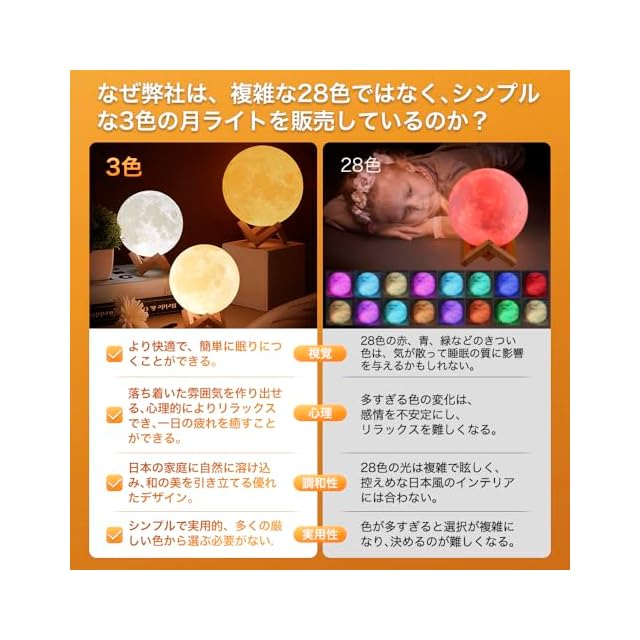 【2023.6.16から進化版・2色を3色に変更】昼白色・温白色・電球色・3色をゆっくり点滅、四つのモードある。暗闇の中でもっと月のような光がよく見える。(外光が強い場合はあまり目立たない場合があります)。充電中に、電流は0.2Aのみ(人体が耐えられる安全な電流レベルをはるかに下回るものです),スイッチのボタンをタッチして絶対に安全です。心配しないでください。