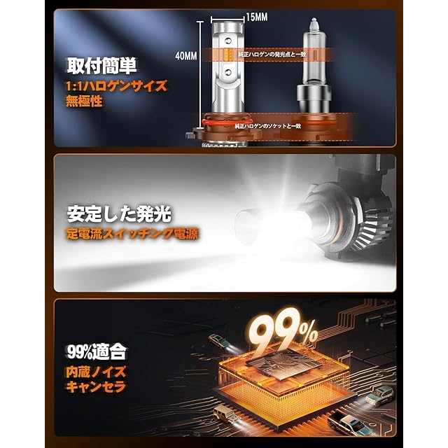 【取り付け簡単99%適合】 安定した発光:定電流スイッチング電源を採用しているため、安定した発光が可能です。電源の安定性により、点滅や明るさの変動などの問題を回避し、一貫した明るさを保ちます。さらに、内蔵のノイズ・キャンセラーIC回路により、99%の9006/HB4形状に適合します。 この LED フォグは、ハロゲンと1:1で再現されたデザインを持ち、既存の取り付け部品と交換するだけで使用できますので、車の改造や取り付け作業に慣れていない方でも、簡単に取り付けることができます。お客様の車に取り付けて、安全かつ快適なドライブをお楽しみください。