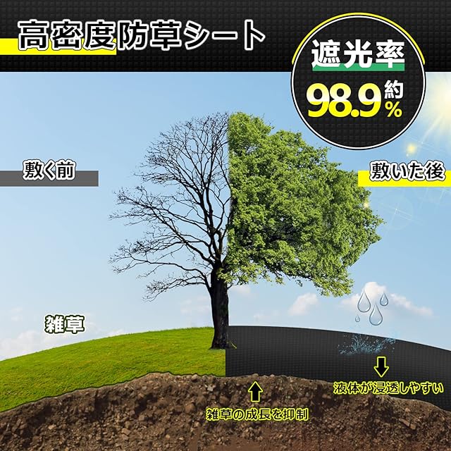 【優れた遮光性】Sumeriy防草シートは遮光率最大98.9%に達します。光を遮断して光合成を防止すくことによって、頑固な雑草にも効果的成長を抑制し、雑草防止の悩みから解放!