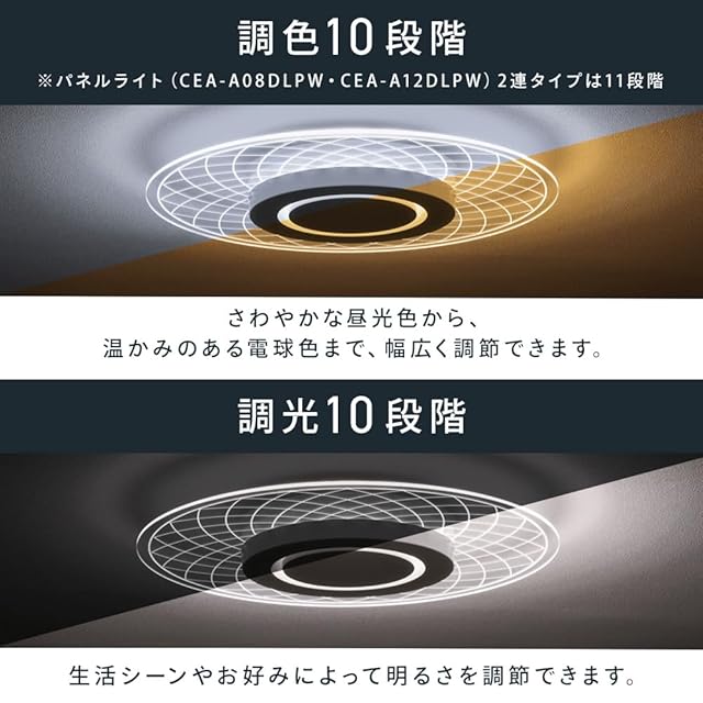 【調光10段階】シーンやお好みによって明るさを調整できます。【調色10段階】さわやかな昼光色から、温かみのある電球色まで、幅広く調節できます。【照らし分け】シーンや気分に合わせて照らし分けることで、しっかり明るいお部屋にも、雰囲気あるリラックスできるお部屋にもなります。