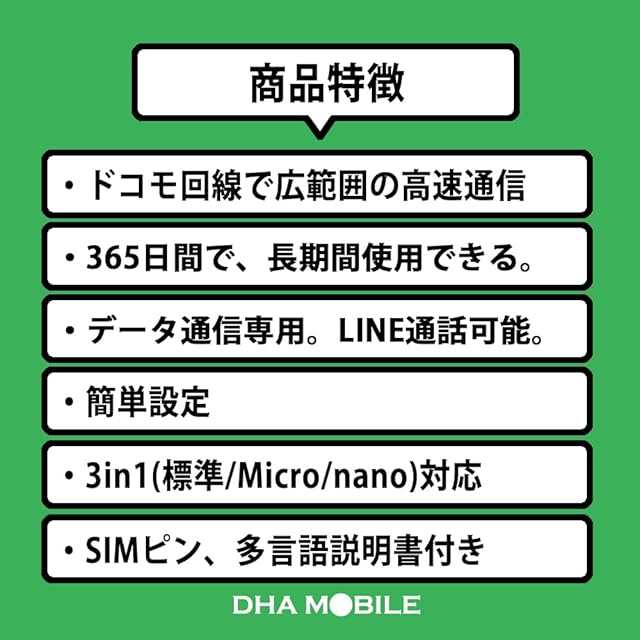 【NTTドコモの通信網で高速通信!】 180日間 15GB、NTTドコモの通信網で広範囲の高速通信!ご購入のデータ容量を使い切っても、180日間は最大速度128kbpsでご利用可能です。【対応SIMサイズ】 標準、Micro、nano サイズ切り替え可能 【製品パッケージ】SIM カード/SIMピン/多言語マニュアル
