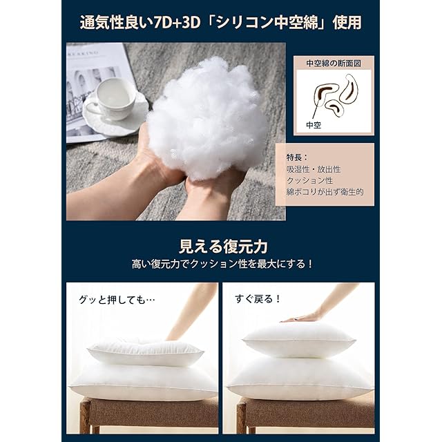 【自社開発7D+3D中空綿+中綿増量15% !】 弊社はより多くの人々の暮らしに寄り添い、快適な生活を実現できるクッションを開発するため、この度は初めて弾力性に優れた7D中空綿と柔らかい3D中空綿を組合わせて贅沢に詰め込みました!7Dと3D中空綿は高級ホテルでよく利用され、羽毛詰より匂いなく、弾力性が高く、長期間使用しても型崩れが起きにくい。綿100%のパイピング縫製を行い、破れや中身の漏れの心配はありません!