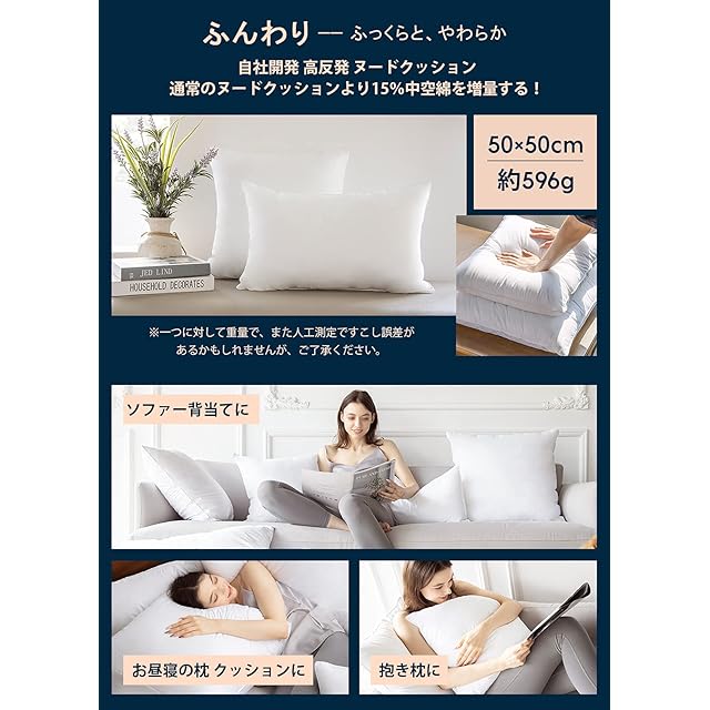 【圧縮梱包でお届け】 本製品は圧縮梱包されお届けします、圧縮加工で真空になるので、ゴミなどが入らない、衛生的です。(クッションの復元方法:商品を開封し袋から取り出して、中央に向かって全体的に空気を入れるように揉んでください。そして、手で触りながら、綿のかたまりを探し、全体をまんべんなくもみほぐしてください。)サイズ:50×50cm 2個セット 側生地:綿100% 充填物:中空シリコン化マイクロファイバー (カバーよりワンサイズ大きめのサイズがおすすめです!もっと厚みがでる!)