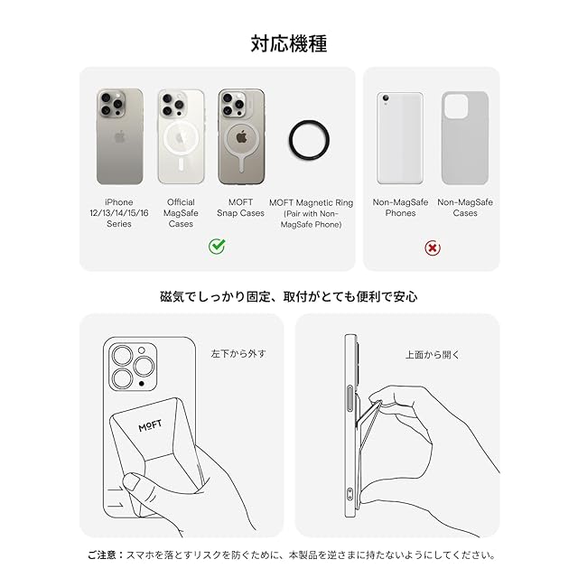 【対応機種と注意事項】iPhone 16 Pro Max/iPhone 16 Pro/iPhone 16 Plus/iPhone 16/iPhone 15 Pro Max/iPhone 15 Pro/iPhone 15 Plus/iPhone 15/iPhone 14 Pro Max/ iPhone 14 Pro/iPhone 14 Plus/iPhone 14/iPhone 13 Pro Max/iPhone 13 Pro/iPhone 13/iPhone 13 Mini/iPhone 12 Pro Max/iPhone 12 Pro/iPhone 12/iPhone 12 Mini全シリーズに対応できます。または、MagSafe機能があるスマホケースやマグネットリングと併用することで使用可能です。*MOFT Snapケースと併用すれば、磁力がさらにアップ!
