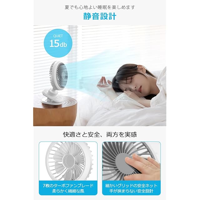 【7枚のターボファンブレードで快適な風を提供する携帯クリップファン】7枚のターボファンブレードを備えたこの携帯クリップファンは、従来のファンに比べて柔らかく繊細な風を作り出します。特にエアコンの風が苦手な方や、長時間風に当たり続けたい方におすすめです。体に優しい風で、疲れを感じることなく快適に過ごせます。コンパクトで軽量な設計により、デスクやベッドサイド、アウトドアなど様々な場所に簡単に取り付けられます。