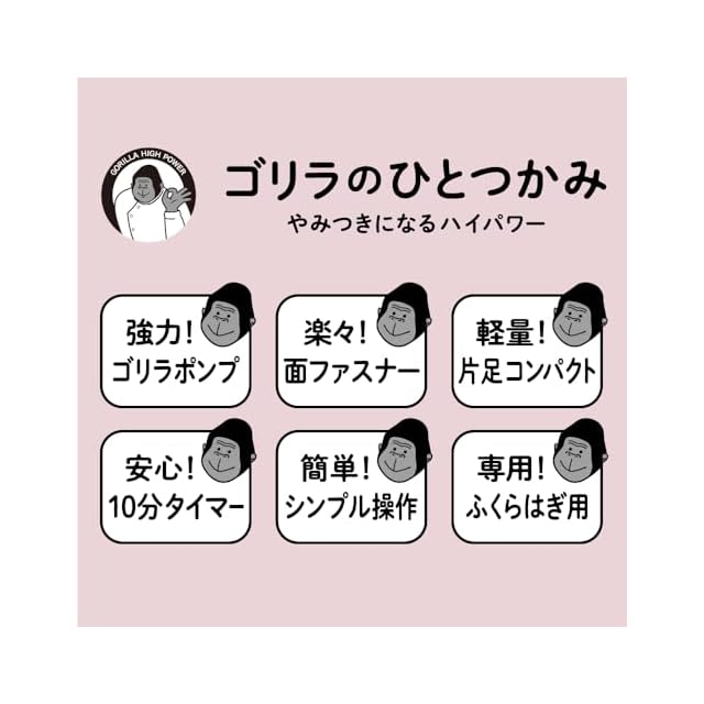 まるでゴリラにつかまれたようなハイパワーふくらはぎケア ゴリラのひとつかみ。ふくらはぎの痛きもちイイがやみつきになる強力ポンプ&エアバッグのゴリラのハイパワーシリーズ『ゴリラのひとつかみ』が誕生。はじめてのふくらはぎケアにピッタリの簡単・お手軽タイプです。