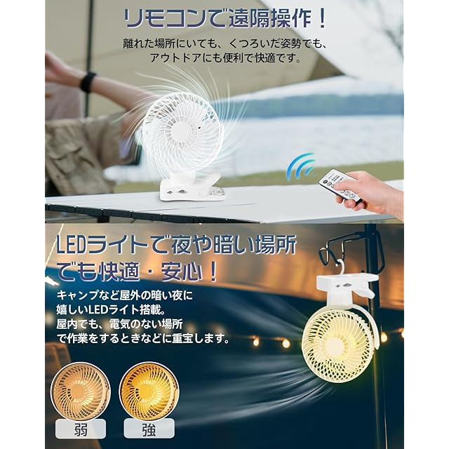 【左右360°自動首振り&10000mAh】 扇風機 クリップ usb充電式 風量3段階 リズム風 リモコン付き 切タイマー 小型 サーキュレーター LEDライト 強風 静音 卓上 車用 キャンプ 暑さ対策 ホワイト