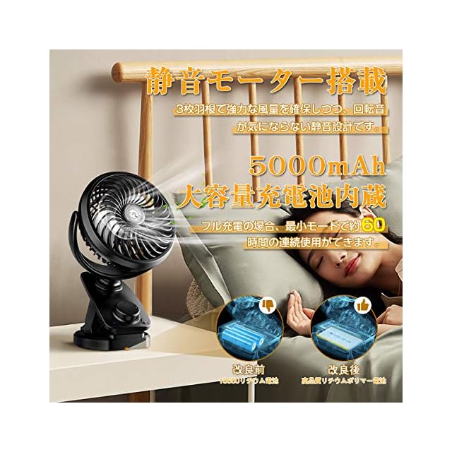 【自動首振り&最大60時間連続使用】 扇風機 小型 充電式 卓上風量無段階調節 5000mAh充電池内蔵 360度角度調整 usbクリップ ミニ 強風 静音設計 アロマ対応 直径14.5cm ブラック