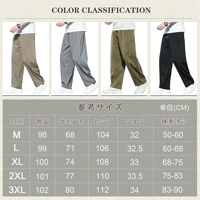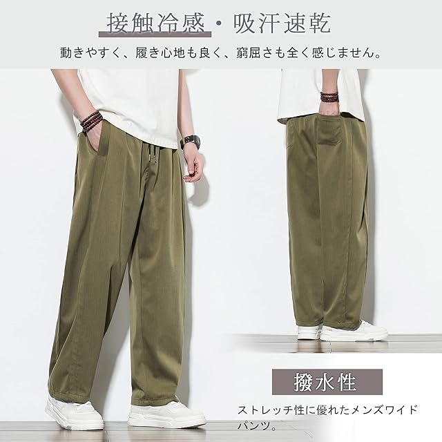 接触冷感・吸汗速乾・撥水性・ストレッチ性に優れたメンズワイドパンツ。サラッとした滑らかな肌触りで暑い日でも快適に過ごせて、ダボつきすぎず、春夏秋にもさわやかに着られます。