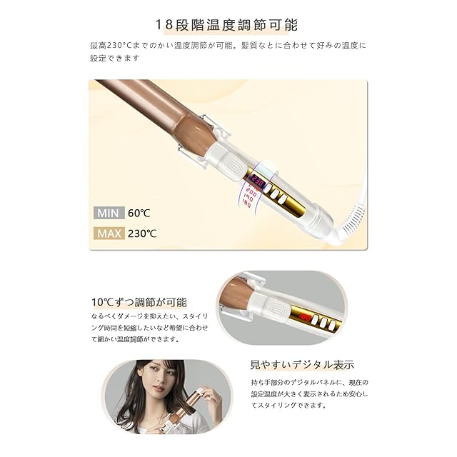 ■みずみずしく弾む目を奪うほど美しいカール§:最高温度230℃のプロ仕様で、60℃~230℃まで、10℃ごとに18段階で温度調整が可能です。髪質やヘアスタイルに応じて切り替えられるのが便利です。VAPAKAのカールアイロンは、髪をやさしく包み、均一に熱を伝えることでみずみずしく弾む立体的なカールを生み出します。毎朝のスタイリングはもちろん、大事なイベントの日、雨で湿気の多い日、デート、パーティ・・・髪をバッチリ決めたいシーンにしっかりとスタイルが決まる。