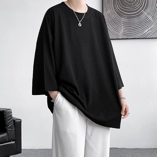 [foveitaa] tシャツ メンズ 夏服 七分袖 おおきい サイズ 涼しい ゆったり かっこいい ビッグシルエット なつふく ストリート 人気 シンプル オシャレ 人気 無地 韓国風ファッション カジュアル トップス 柔らかい肌触り 洋服 軽い 柔らかい Black-3XL
