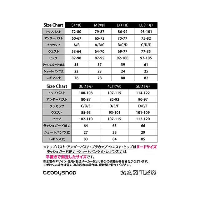 Size 3L(15号),トップバスト-100-108cm,アンダーバスト-80-87cm,ブラカップ-Cカップ/Dカップ/Eカップ,ウエスト-85-93cm,ヒップ-102-110cm,ラッシュガード着丈-64cm,ショートパンツ丈-27cm,レギンス丈-83cm