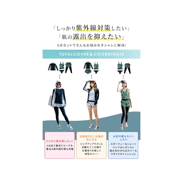 セット内容・5点セット・タンクトップ・トップス・パンツ しっかり体型カバーできる長袖&レギンス☆動きやすさも◎ フィットネス水着レディース上下セット パッド有無○ パッドポケット○ ワイヤー× 肩ひも取り外し× 肩ひも調節× アンダー調節○