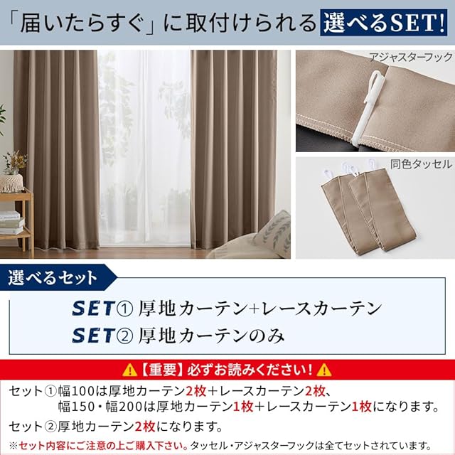 おしゃれな厚地カーテンとレースカーテンのセットで、届いたらすぐ使えるアジャスターフック付のお買得カーテンセット。
