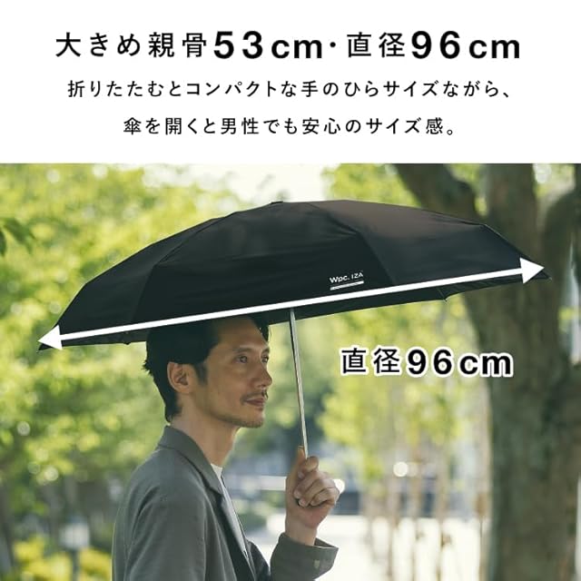 【ZA007:Light&Slim】 重さ約190g/収納時の横幅約5cmと、IZA史上もっとも軽量でスリムなフォルム。 軽量でありながら、開いた時の直径は約90cmと男性でもしっかりカバーしてくれるサイズ感を実現。 カラビナ付きなのでバッグに取り付けることも可能。 ワンアクションでスムーズに開閉できます。
