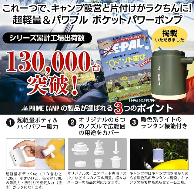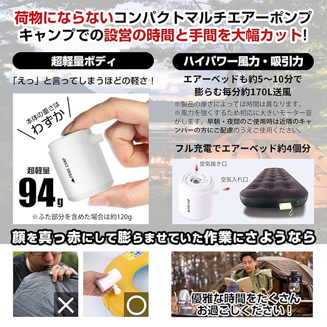【超軽量&強力電動エアーポンプ】超軽量モデルの電動エアーポンプ。本体重量は約94g(フタ含む120g)。コンパクトだけど風密度170L/分と強力で、インフレーターマットなどの空気入れ/空気抜きをしっかりサポートします。 キャンプ、アウトドアでこれがあれば準備が楽ちんです。