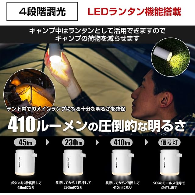【4段階調整ライト機能付き】 4段階調整のライト機能つきなのでキャンプ中はランタンとしても活躍できます。最大明るさ410ルーメンなので、テント内のメインランプとしても活躍できます。ランタンをわざわざ持っていかなくていいのでキャンプの荷物も減らせて一石二鳥です。