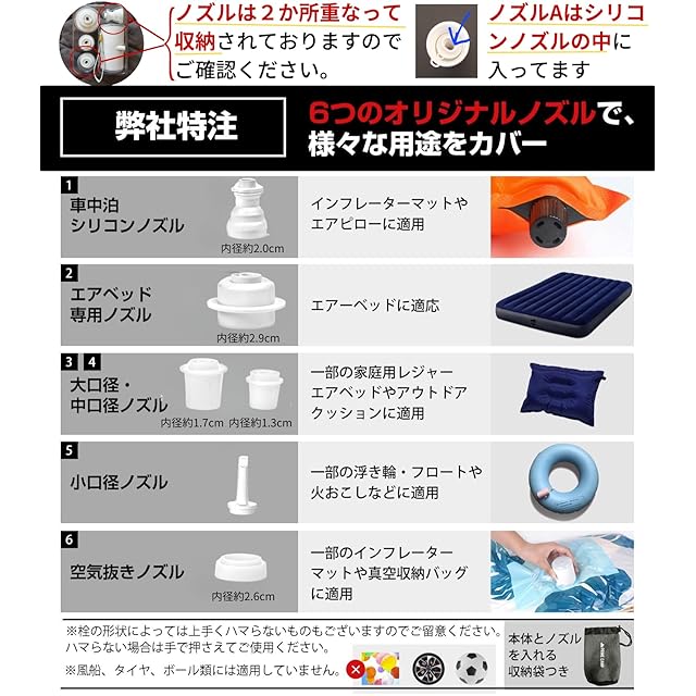 【6つのノズルで様々な用途をカバー】 弊社オリジナルのエアーベッド専用ノズルなど6つのノズルを用意。キャンプのインフレーターマット、エアークッションはもちろん、BBQの火起こしの送風、夏の浮き輪など様々な用途で活躍します。※製品によってはどのノズルもしっかりハマらない可能性がございます。その場合は手で押さえながらご使用ください。