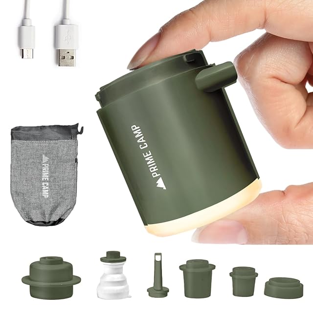 キャンプ エアーポンプ 電動 空気入れ 超軽量 強力170L/分 【6つのノズル&ライト付】 エアポンプ 1360mAh大容量バッテリー USB充電式 空気抜き インフレーターマット キャンプ 浮き輪 (オリーブグリーン)