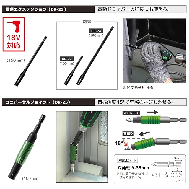 DR-23/叩いて使える、タフネス構造のエクステンションバー。DR-25/壁際のネジもはずせるジョイント付きエクステンション。
