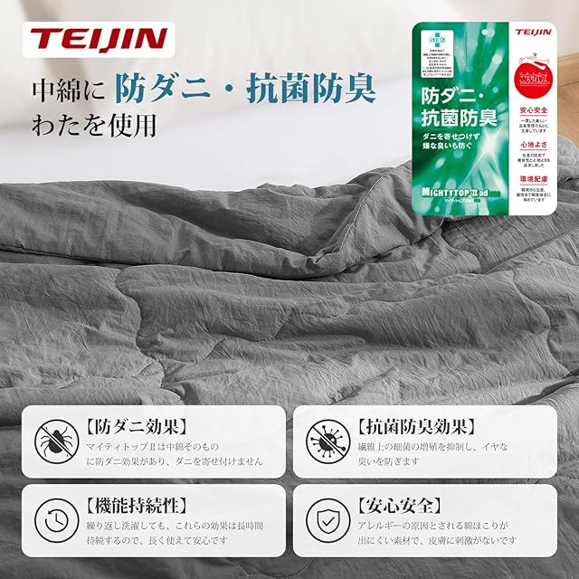 ☁ 中綿に防ダニ・防菌防臭のTEIJIN綿を使用しているので、細菌の増殖を抑制し、イヤな臭いを防いで、アレルギーの体質の方にも適しています。