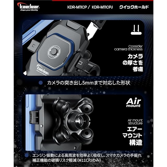 Kaedear(カエディア) バイク スマホホルダー バイク用スマホホルダー 携帯ホルダー 振動吸収 マウント 対応 スマホ スタンド アルミ製 マウント ハンドル ミラー 原付 オートバイ 自転車 / スマホ厚さ15mmまで, 縦長スマホ, カメラ突き出し,対応/アームロック機構, クイックホールドⅡ KDR-M11CP-BK