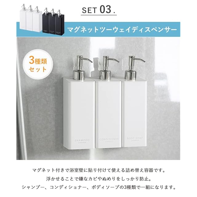 [仕様]完成品、生産国:中国、取り付け可能な壁面:マグネットがつく平らな面・スチール壁面、【風呂イス】耐荷重:約100kg、耐熱温度:約70℃、耐冷温度:約-40℃ / 【湯おけ】容量:約2.5L、耐熱温度:約170℃、耐冷温度:約-40℃、取り付け可能なパイプ:直径約3cm以下 / 【ディスペンサー】タイプ:シャンプー・コンディショナー・ボディソープ、耐熱温度:約90℃、耐冷温度:約-40℃、耐荷重:約1kg、容器容量:500ml、対応サイズ:詰め替え用パック400ml以内のもの