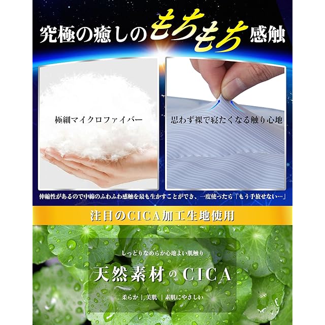 【極柔タッチ×CICA加工】究極の肌触りをを求め、一から糸と生地を開発。➡①弊社の研究者は研究に研究を重ね、特殊冷感ファイバーに極細のマイクロファイバー糸を加え、特殊な技法で交編し、こだわり抜いた極柔冷感敷パッドを開発しました!新感覚の「ひんやり涼しさ」と「とろとろ柔らかさ」を体感でき、一晩中快適な眠りを体験!➡②また、CICA加工で「天然由来の保湿成分」CICA(ツボクサエキス)を配合することで、保湿効果を高めています。しっとりなめらかできめの細かい肌ざわりが心地よい眠りへ誘い、お肌のケアと質の良い睡眠を同時にかなえることができます。