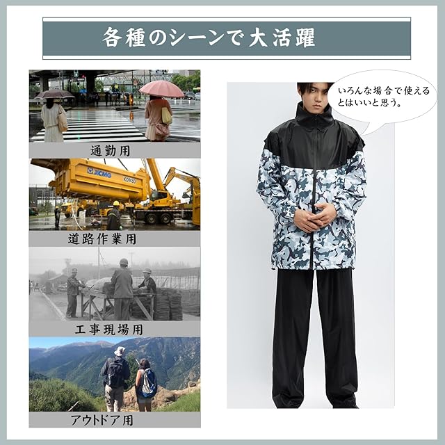 【様々なシーンで大活躍】レインウェアとしてはもちろん、通勤、通学、作業、釣り、走る、自転車、登山、サイクリング、散歩。