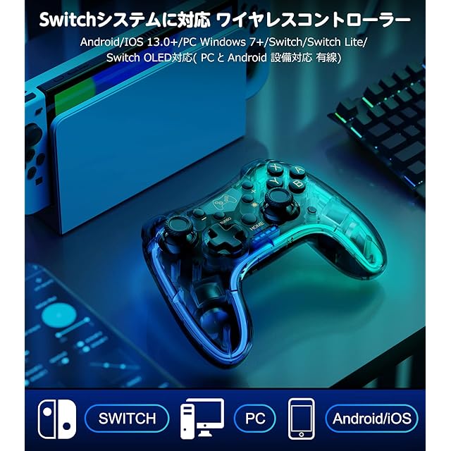 【多種機種対応】全てのSwitchシステムに対応できます。IOS 13.0及びその以降のバージョン対応、PC Windows 7+、Android、Stadia、Luna、SteamなどPCゲームプラットフォームにも適用できます。【十色変換ランプ ・アプリコントロール】透明な材料で作られた外観、10色ランプ内蔵スケルトンコントローラーです。お好みの色に設定したり、10色に変化させたり様々なカスタマイズが可能。また、アプリコントロールも対応でき、「KeyLinker」APPでキーを変更、スティックの不感帯を調整、振動調節、キャリブレーション、アップグレード、様々なシーンがAPPで自由にコントロールできるのは大変便利。