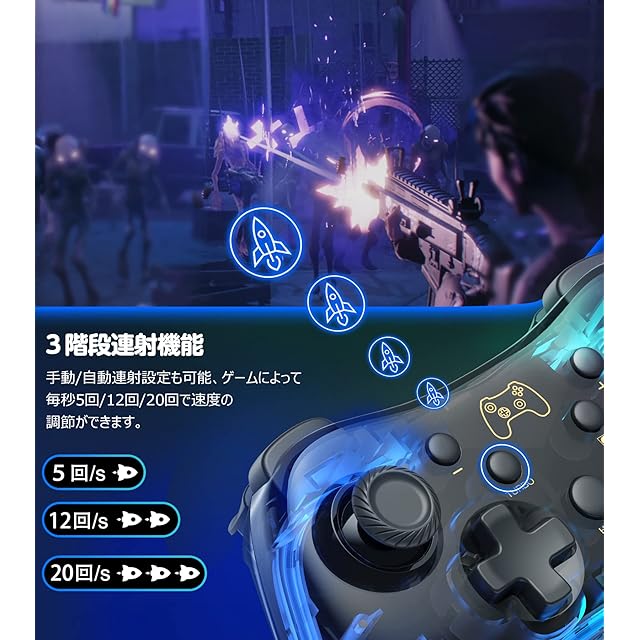 【ジャイロセンサー・連射機能搭載】このSwitchコントローラーはジャイロセンサーを搭載し、体感型ゲームをやる時には、しっかりと振動が手に伝わります。連射機能が搭載されているから、対戦の時に有利になります。連射スピードは3段階(5回/秒、12回/秒【ジャイロセンサー・連射機能搭載】このSwitchコントローラーはジャイロセンサーを搭載し、体感型ゲームをやる時には、しっかりと振動が手に伝わります。連射機能が搭載されているから、対戦の時に有利になります。連射スピードは3段階(5回/秒、12回/秒、20回/秒)を自由に切り替えられ、格闘系ゲームなら、是非この連射機能を利用すれば、勝率をアップさせましょう!※ご注意:Amiibo機能に対応を致しませんので、予めご了承ください。ジャイロセンサーは全てのSwitchシステムにのみ適用されます。、20回/秒)を自由に切り替えられ、格闘系ゲームなら、是非この連射機能を利用すれば、勝率をアップさせましょう!※ご注意:Amiibo機能に対応を致しませんので、予めご了承ください。ジャイロセンサーは全てのSwitchシステムにのみ適用されます。
