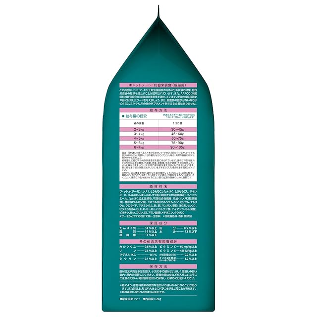 原材料:フィッシュ(サーモン、ツナ)、とうもろこしたんぱく、とうもろこし、チキンミール、米、小麦たんぱく、小麦、大豆粉、鶏脂(オメガ6脂肪酸源)、フィッシュミール、たんぱく加水分解物、可溶性食物繊維、魚油(オメガ3脂肪酸源)、酵母(βグルカン源)、ミネラル類(カルシウム、リン、カリウム、ナトリウム、クロライド、マグネシウム、鉄、銅、マンガン、亜鉛、ヨウ素、セレン)、ビタミン類(A、D、E、K、B1、B2、パントテン酸、ナイアシン、B6、葉酸、ビオチン、B12、コリン、C)、アミノ酸類(メチオニン、タウリン)